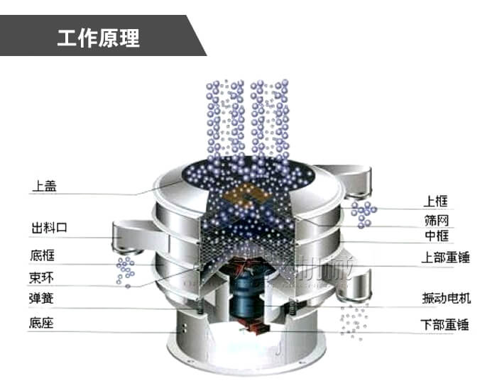 圓形旋振篩主要由進(jìn)料口、防塵蓋、出料口、束環(huán)、篩網(wǎng)、配重塊、上部重錘、振動體、振動電機(jī)、彈簧、下部重錘、機(jī)座等部分組成。