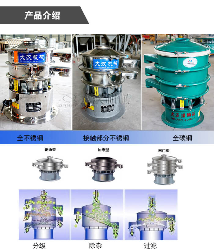 圓形旋振篩又叫圓形三次元旋振篩,主要由碳鋼、不銹鋼及全不銹鋼三種材質(zhì),大漢圓形旋振篩廠家直銷,型號多,關(guān)鍵是圓形旋振篩價格便宜,歡迎用戶來咨詢.